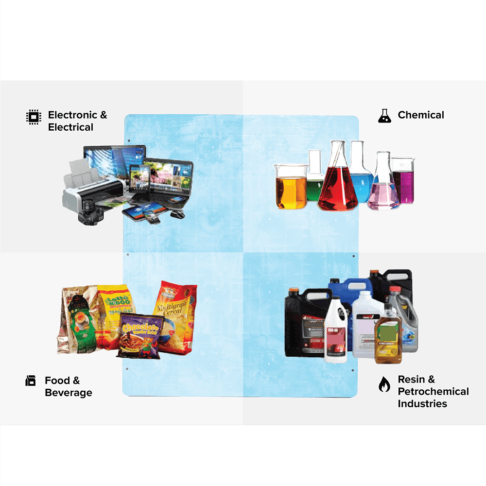 - Electronic & Electrical, Food & Beverages, Oleochemical & Petrochemical industries